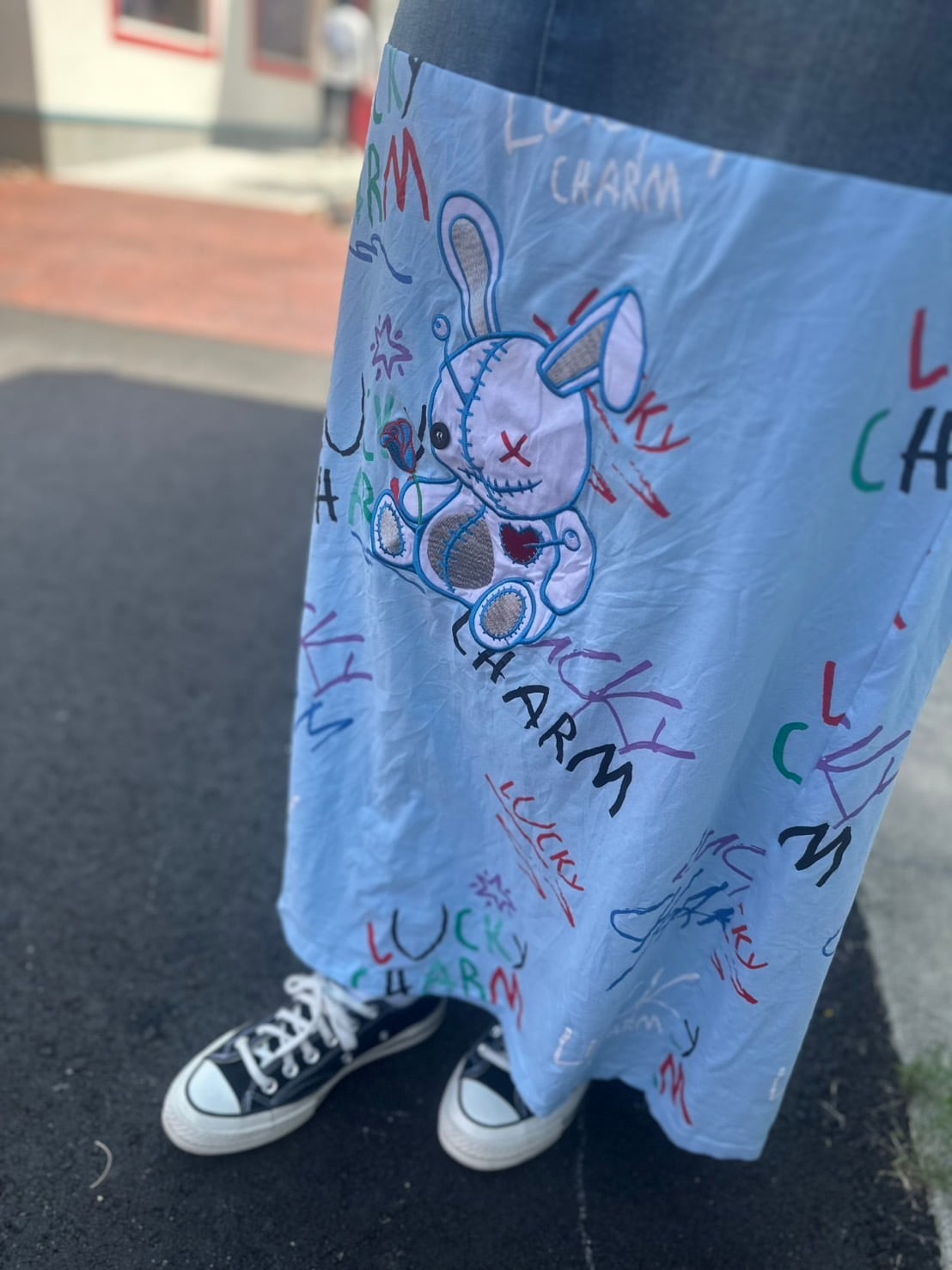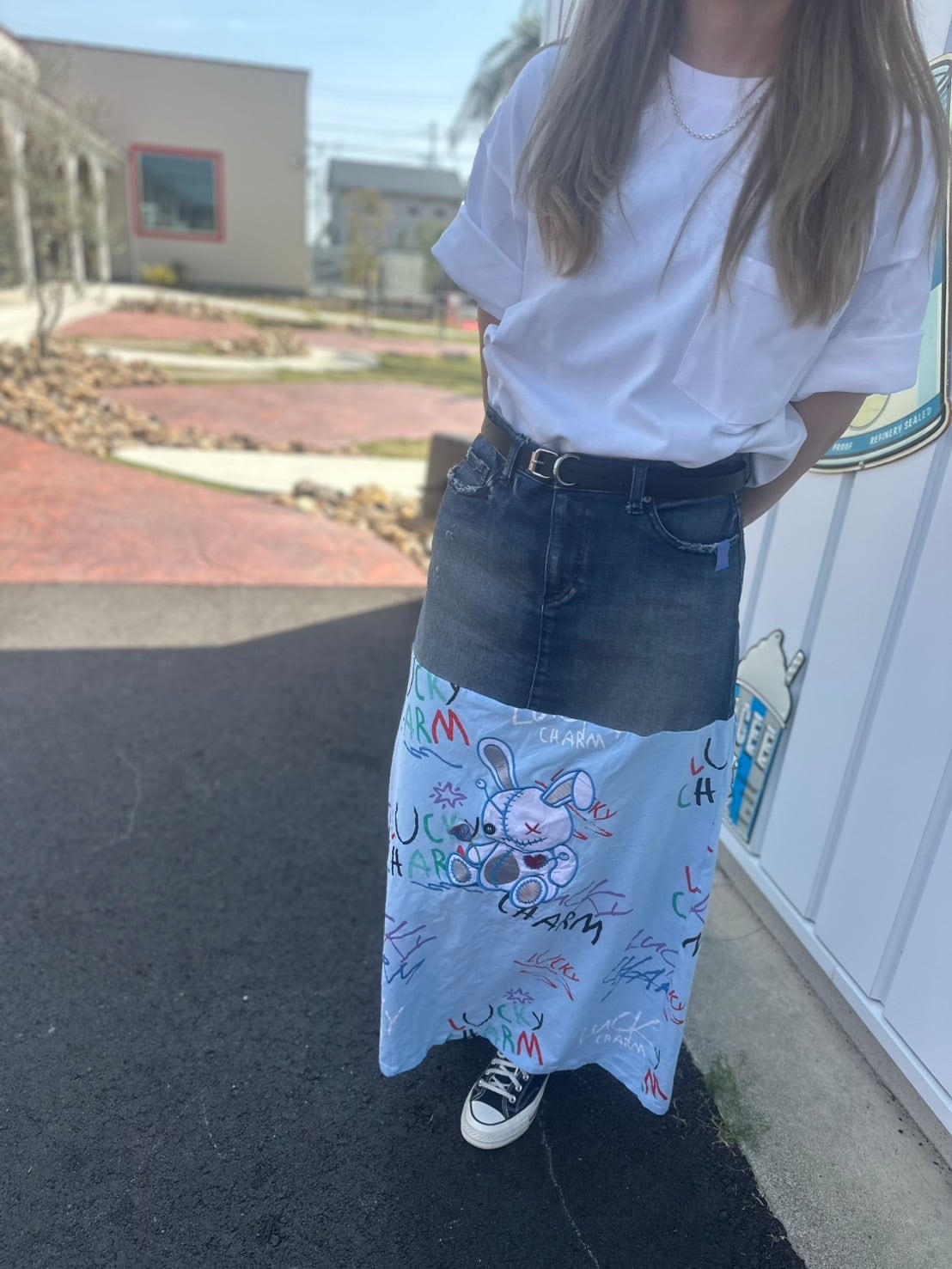 少し濃い目のデニムに刺繍Tシャツをドッキングしてロングスカートにしました。