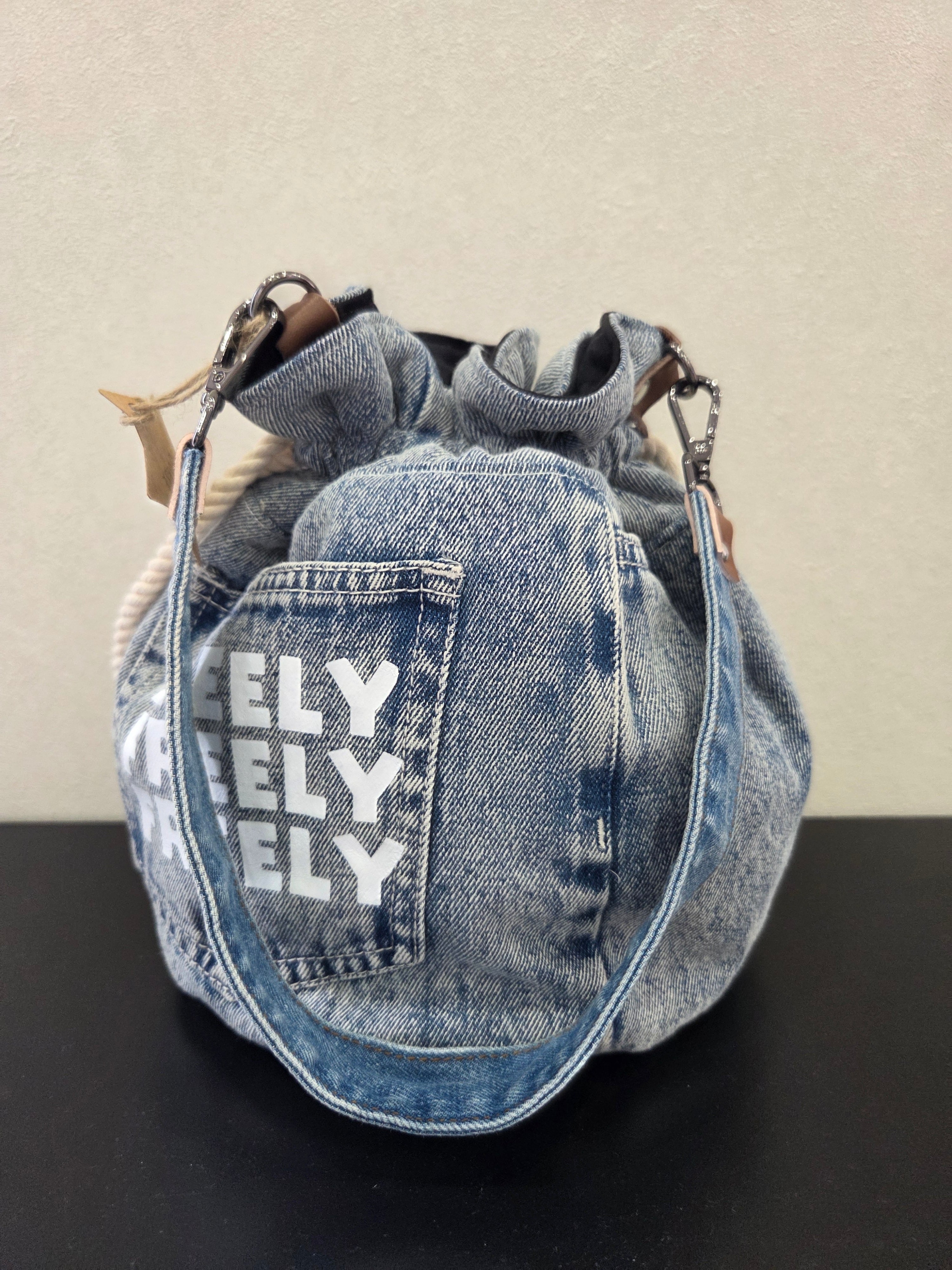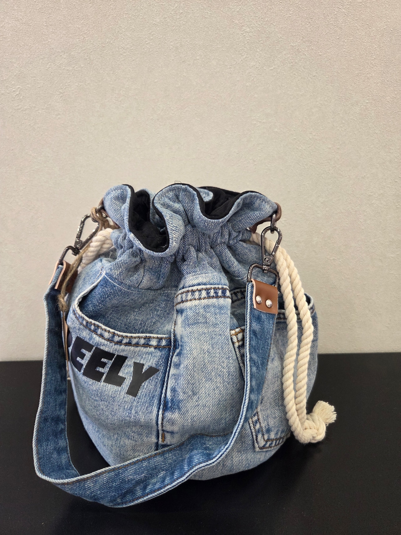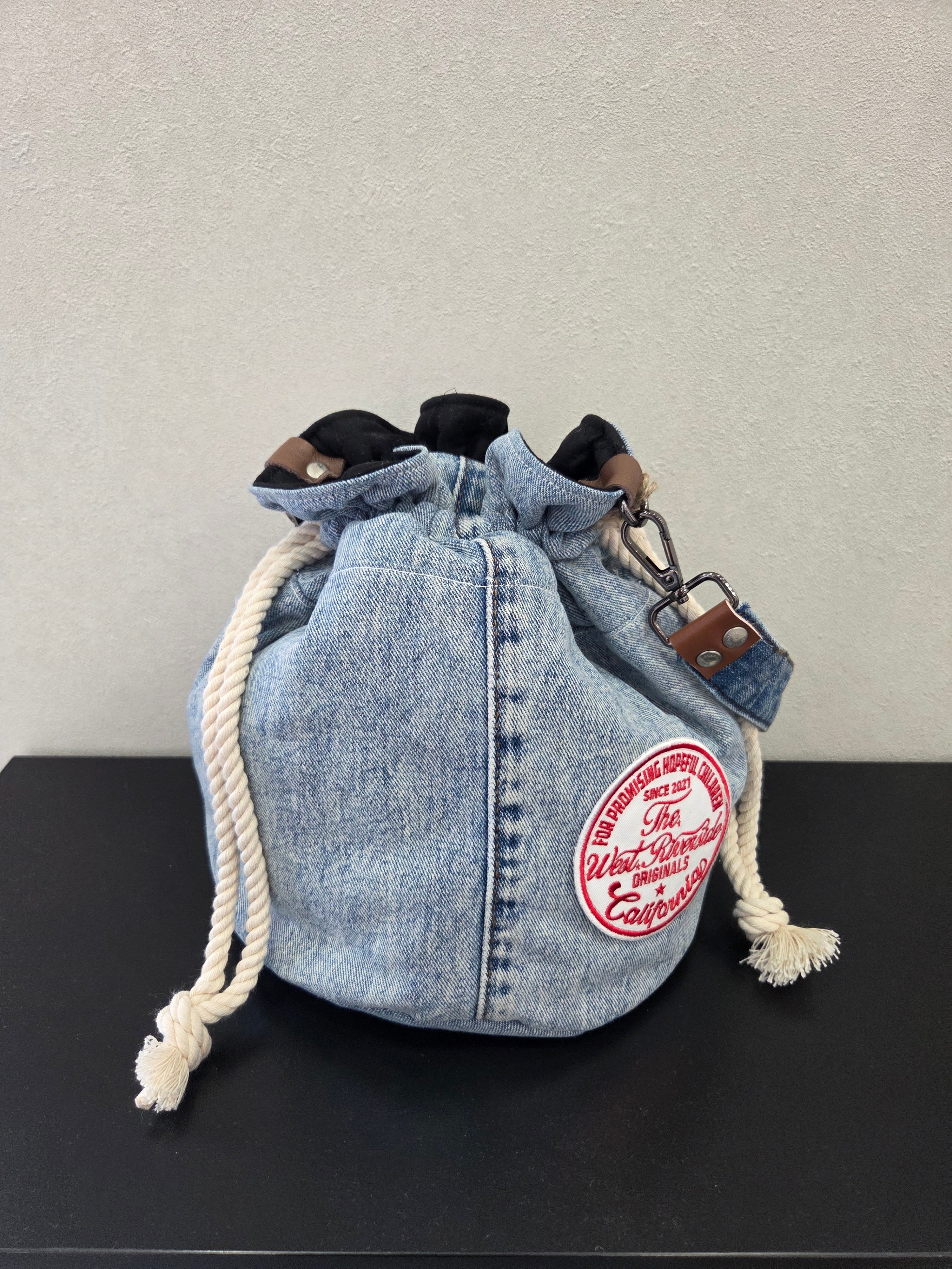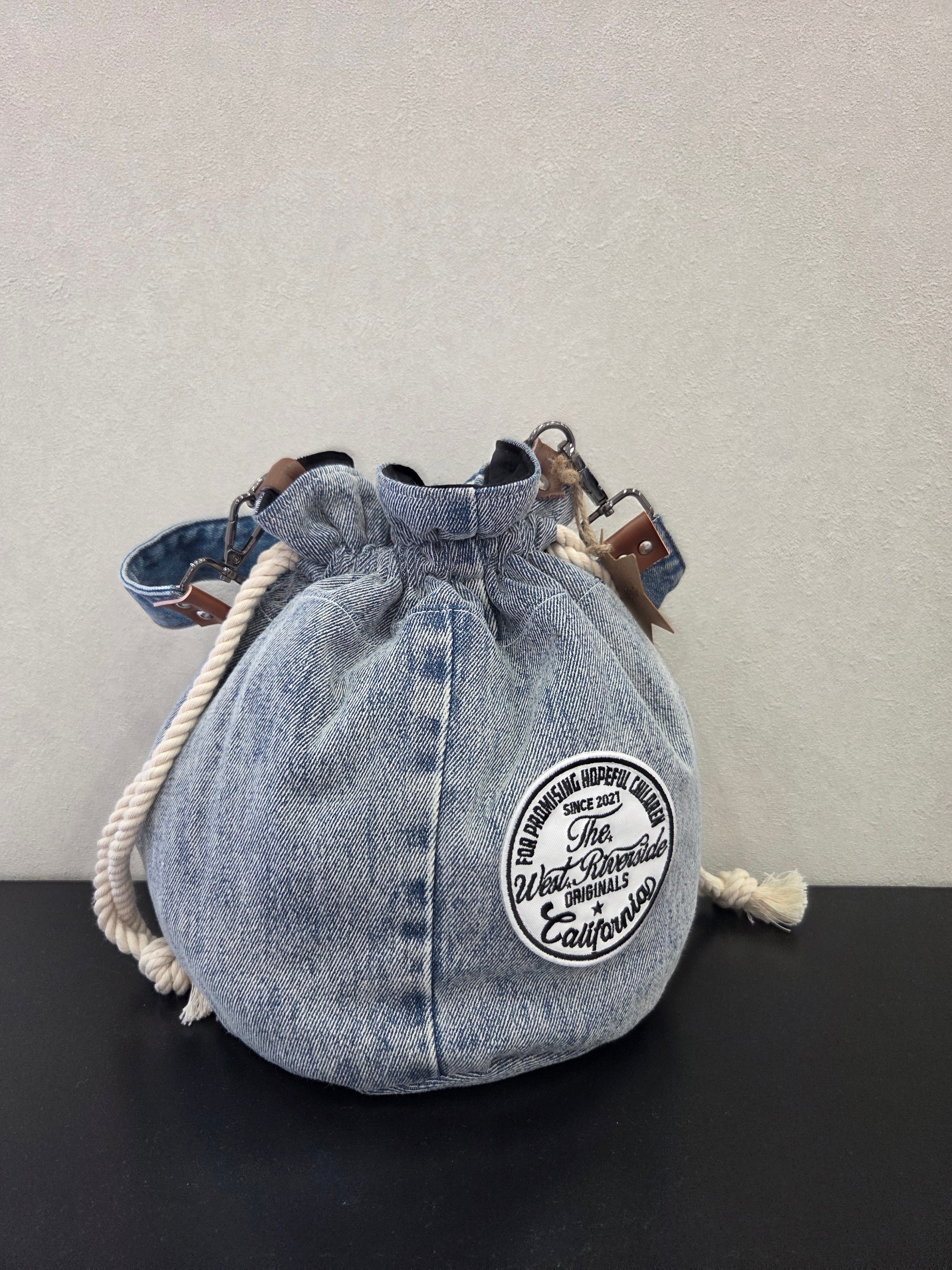 夏らしい薄いカラーのデニム生地でできた人気の巾着バッグです!
