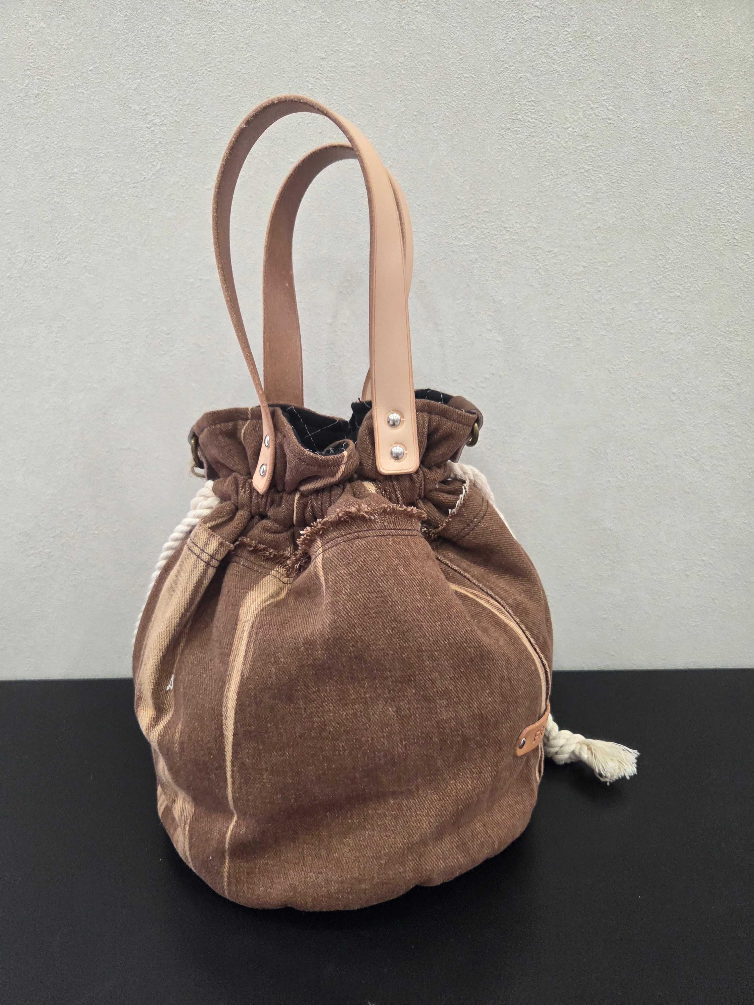 これからの季節に使いやすいブラウンカラーのデニムと持ち手のレザーが可愛い巾着BAGです!