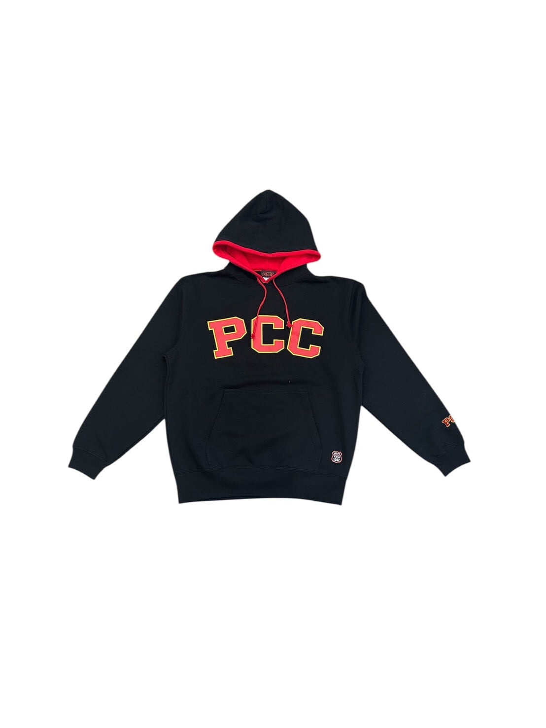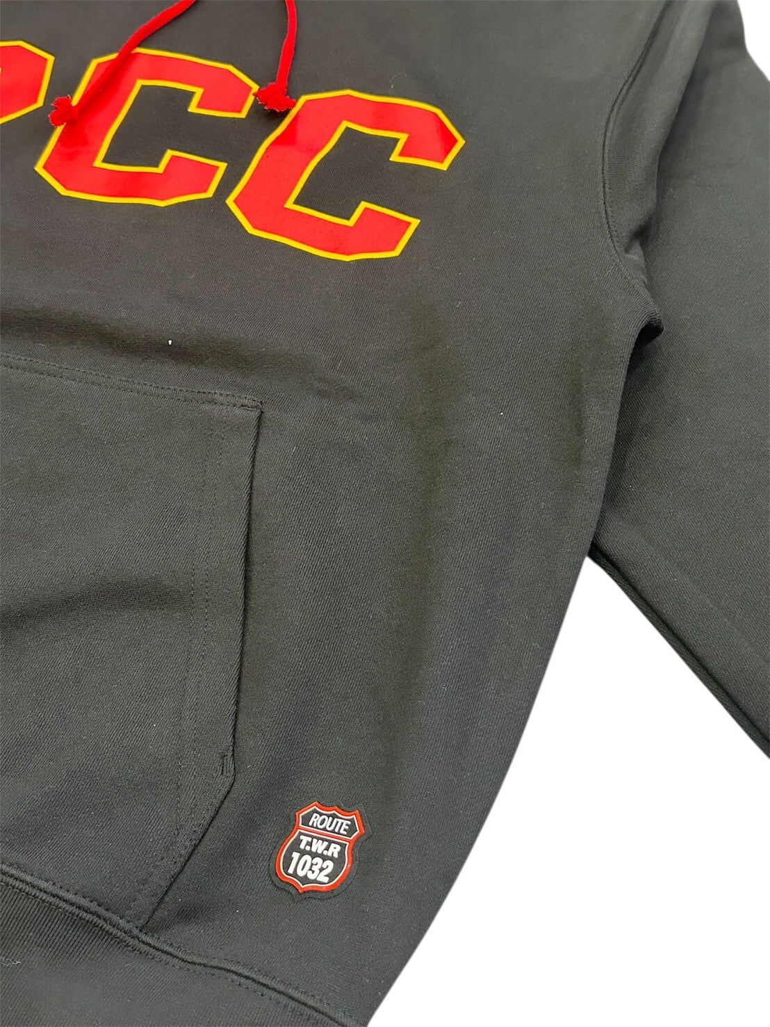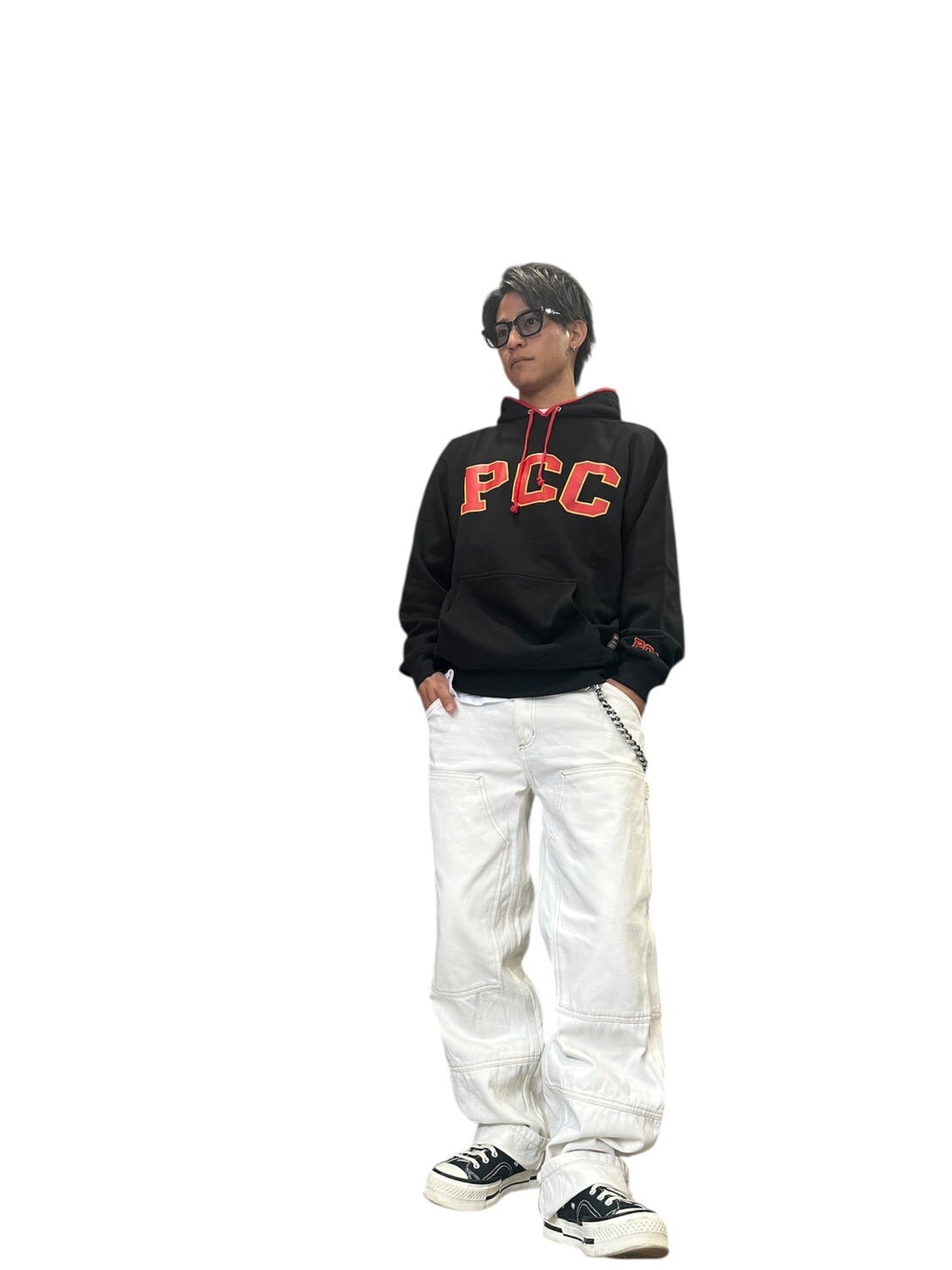 大きめプリントと袖の刺繍、ワッペン付きで目を引くフーディです。