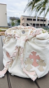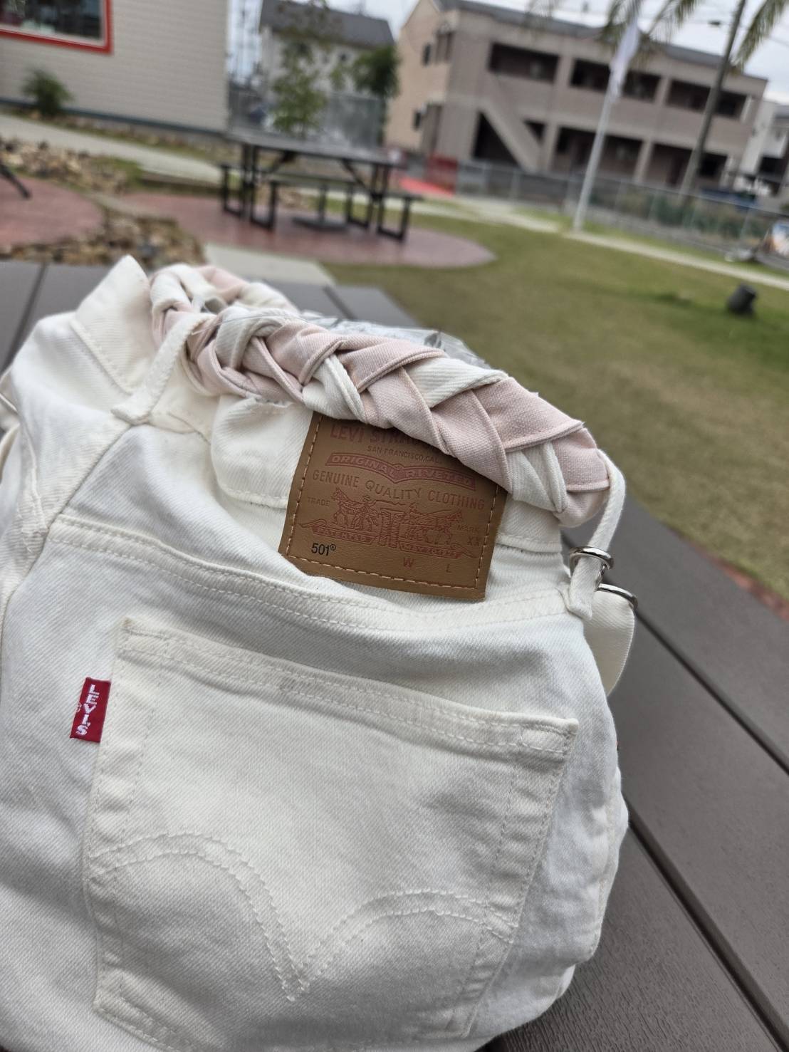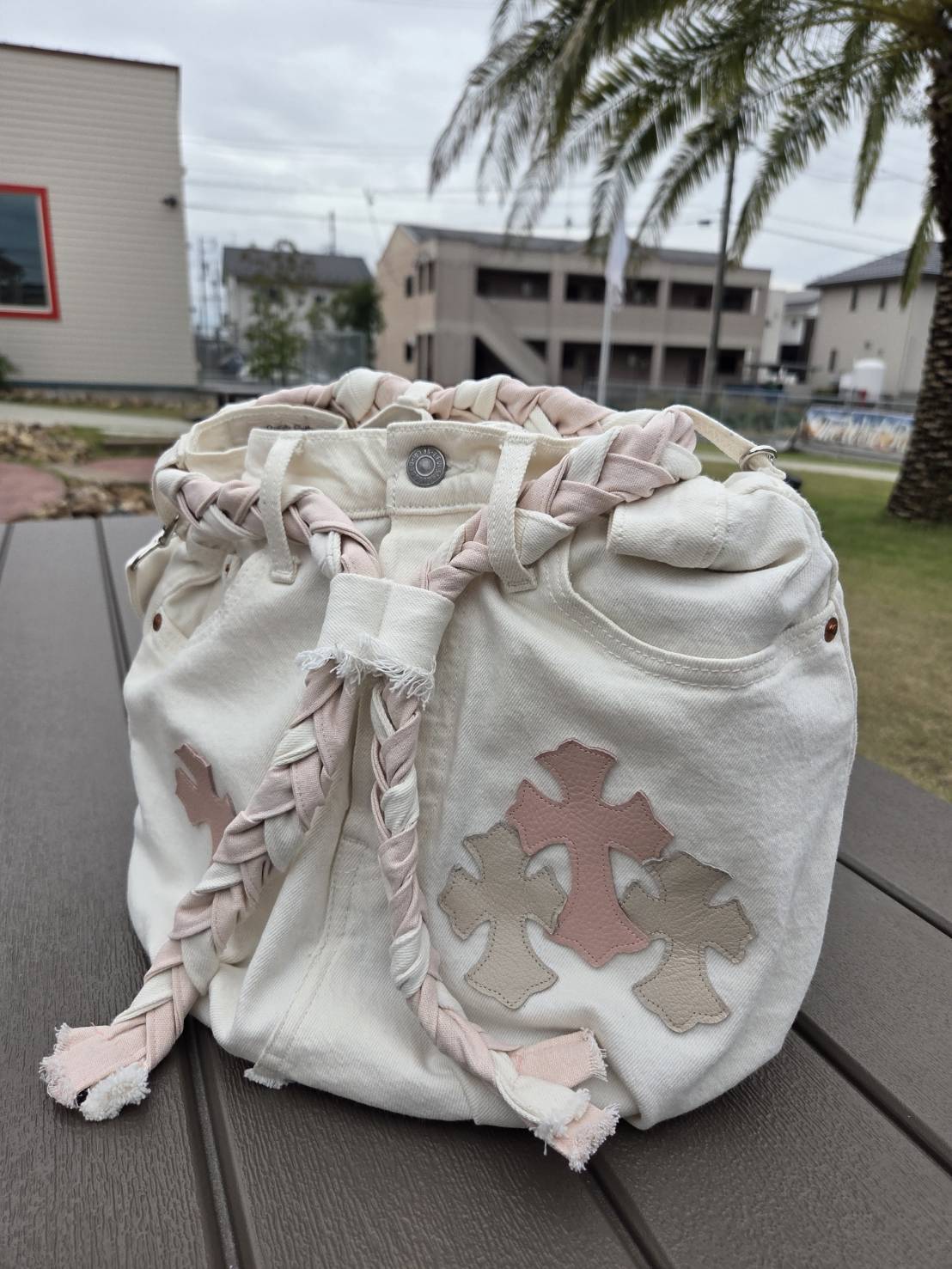ベースに使っているのは、誰もが愛するLevi's 501のホワイトデニム。自社工場でひとつひとつ丁寧に、デニムの丈夫さを活かした巾着スタイルに作り替えました。淡いピンクやベージュのクロスパッチは、どこか優しげで洗練された西海岸の空気を運んでくれます。